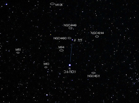 この星座には、子持ち銀河として有名なM51や,M63,M94,M106などの銀河と、M3という6等級の球状星団や、他にも多くの美しい天体があります。
