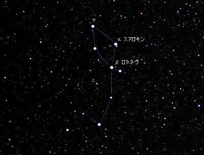 この星座のγ(ガンマ)星は二重星で小口径の望遠鏡で黄い3.9等星と青い5等星の星に分離することができます。