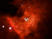 オリオン大星雲の中心部で、星の生れる場所。中ほどに見える4つの星は生れたばかりの星々です。